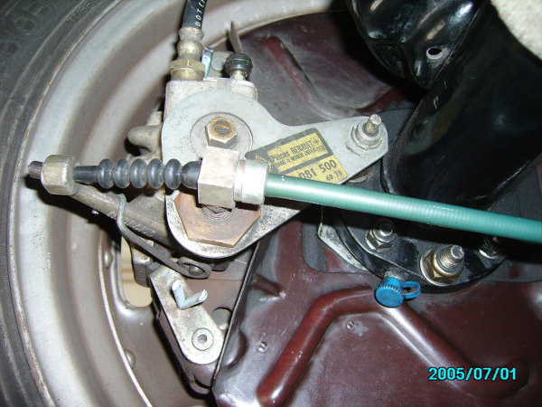 Hinten links – rechts – links einstellen. So wird erreicht, dass das Seil auf beiden Seiten gleichmäßig gestrafft wird. Bei dieser Prozedur wird nach alter Regel der Griff bis zur dritten Raste gezogen --- nach meiner Regel sollen schon in der ersten Raste die Räder soeben schleifen. Dann die Bolzen am Bremssattel wieder einen „Hauch“ herausdrehen.