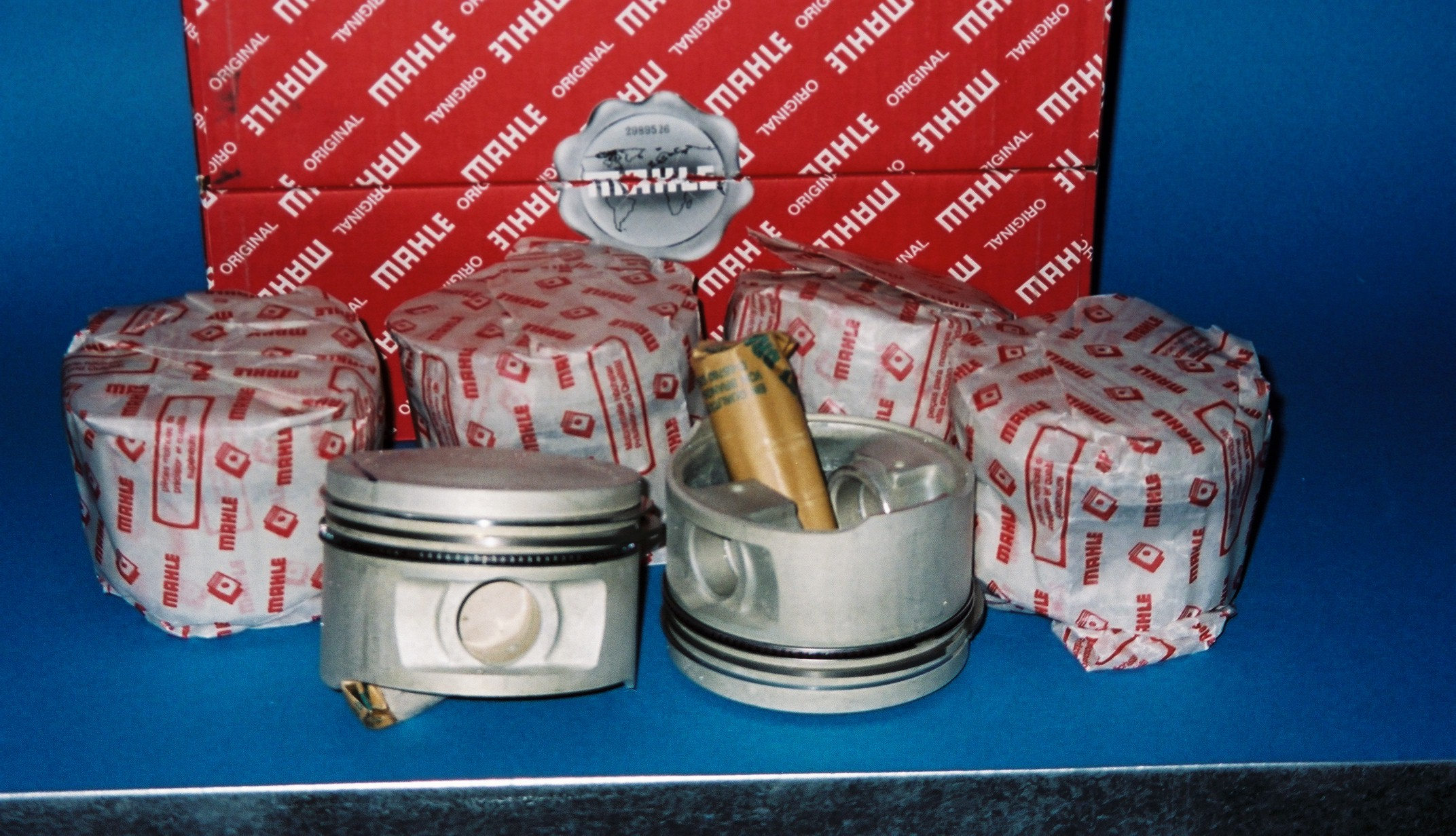 Satz sechs nagelneuer Original-Kolben mit Bolzen und Ringen.